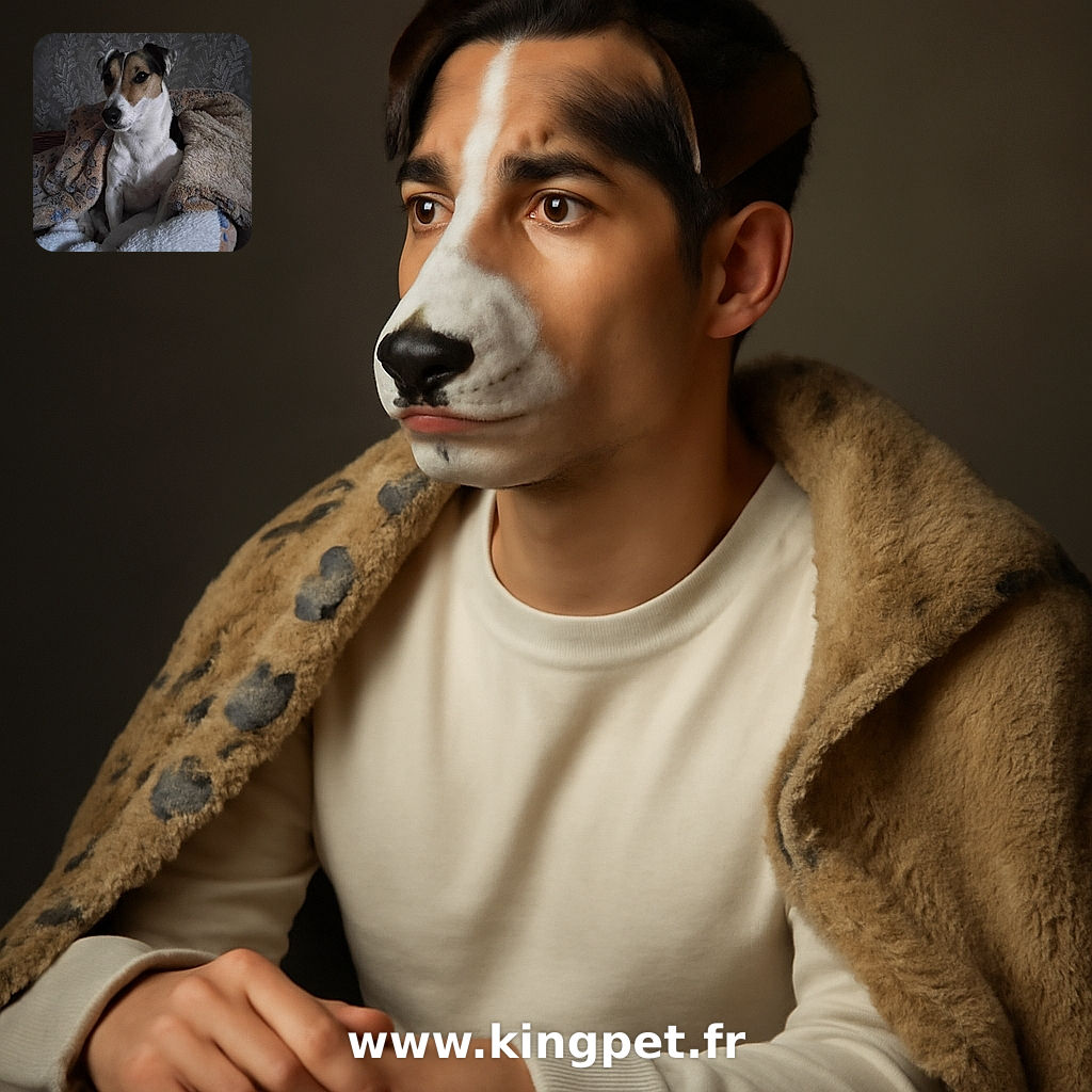 • A charming scruffy dog with a curious expression sits on a cozy bed, its fluffy fur and soulful eyes stealing the spotlight against a plain curtain background.