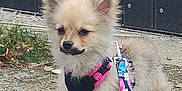• Alma a rejoint le concours — aidez-le/la à gagner de superbes lots ! dog, small_dog, outdoor, leash, harness, gravel, grass, pet, animal, cute, fur, ears, standing, alert, nature, walking, companion, canine, paws, background