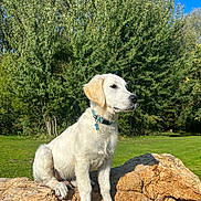 • Aston participe au concours pour gagner de l'argent avec cette photo : puppy, dog, white_dog, collar, outdoor, park, green_grass, tree, sunlight, blue_sky, wood, log, nature, animal, pet, sitting, young_dog, daytime, fur, cute