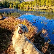 • Timy a rejoint le concours — aidez-le/la à gagner de superbes lots ! dog, golden_retriever, lake, water, grass, trees, mountains, sky, sunlight, nature, outdoor, animal, canine, autumn, reflection, happy, pet, landscape, wildlife, scenic